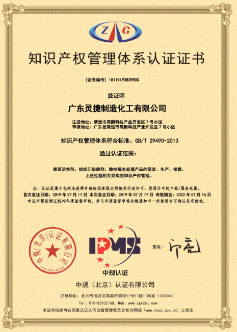 靈捷制造化工于2019年7月17日正式獲得由中規(guī)(北京)認(rèn)證公司頒發(fā)的《知識(shí)產(chǎn)權(quán)管理體系認(rèn)證證書》(證書編號(hào):18119IP3839R0S),這標(biāo)志著我公司在知識(shí)產(chǎn)權(quán)創(chuàng)造、運(yùn)用、管理和保護(hù)方面邁入國(guó)內(nèi)領(lǐng)先水平。
